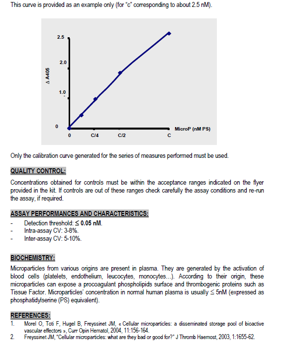 The diluted assayed plasma sample, supplemented with calcium, Factor Xa and thrombin inhibitors, is introduced into one of the microplate wells coated with Streptavidine and biotinylated Annexin V, then incubated. Following a washing step, the Factor Xa-Va mixture containing calcium, then the purified prothrombin, are introduced. When present in the tested sample, microparticles bind to Annexin V and expose their phospholipids surface, thus allowing to FXa-FVa, in presence of calcium, to activate prothrombin into thrombin. The phospholipids concentration is then the limiting factor. There is a direct relationship between the phospholipids concentration and the amount of thrombin generation, which is measured via its specific activity on the thrombin substrate. The reaction is stopped with 2% Citric Acid and Absorbance is measured at 405 nm (A405). TESTED SAMPLES:
