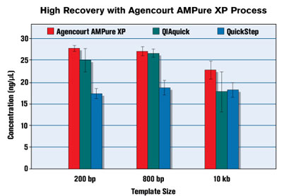 Agencourt AMPure XP可以结合大于100bp的核酸片段,对于片段长度为10KB的长片段,也能获得比传统过柱法高得多的得率。